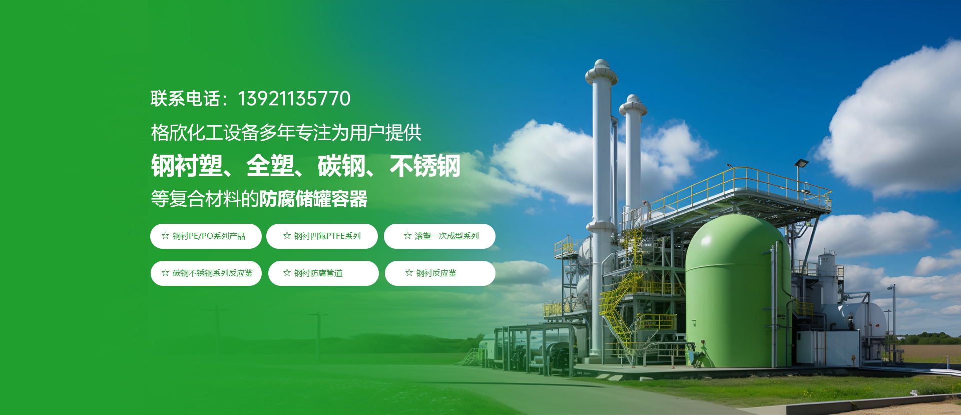 无锡格欣化工设备有限公司是一家集研究、开发、生产、销售于一体的专业生产防腐化工设备的企业。公司主要技术和管理人员从事滚塑产品的研究、生产均有十多年的经验。工厂目前能够生产各类钢衬塑、全塑、碳钢、不锈钢等复合材料的防腐储罐容器。其中生产的立式、卧式、异形多种式样的PE、PP、PO、PTFE制作的钢塑复合储罐、槽罐、运输罐及多种特种罐共有约200多种型号,产品采用滚塑一次成型技术、无接缝、不渗漏,具有强度高、耐腐蚀、重量轻、抗老化、抗冲击、无毒性、寿命长等特点。